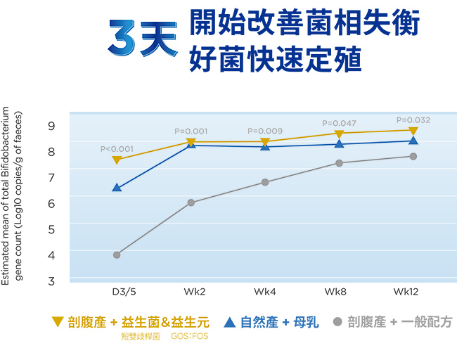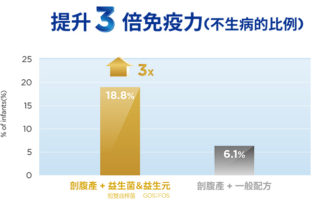 研究發現有攝取短雙歧桿菌+益生元組合的剖腹產寶寶,寶寶腸道內雙歧桿菌數量在3-5天即接近母乳餵養的自然產嬰兒水準,並持續至四周後。