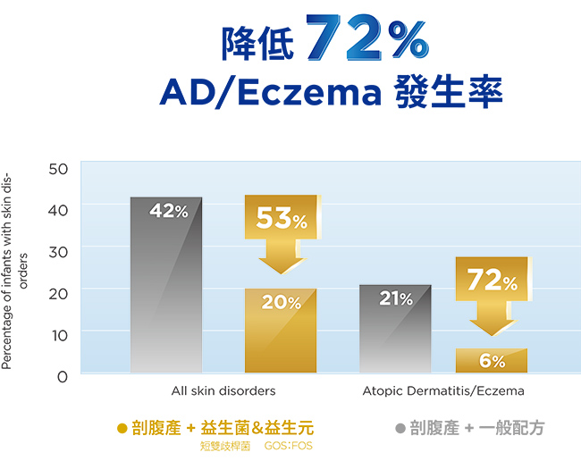 ● 降低53%皮膚不適症狀及72%異位性皮膚炎/濕疹發生機率¹