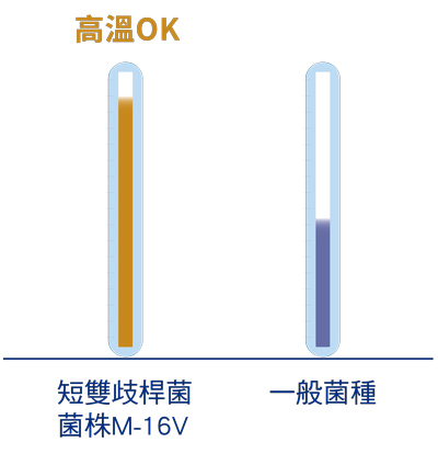 大多數的益生菌怕高溫,但短雙歧桿菌之獨特的M-16V菌株不怕高溫沖泡,經實證即使高溫沖泡也能維持效益,爸媽在準備配方奶更便利、不怕養分流失。
