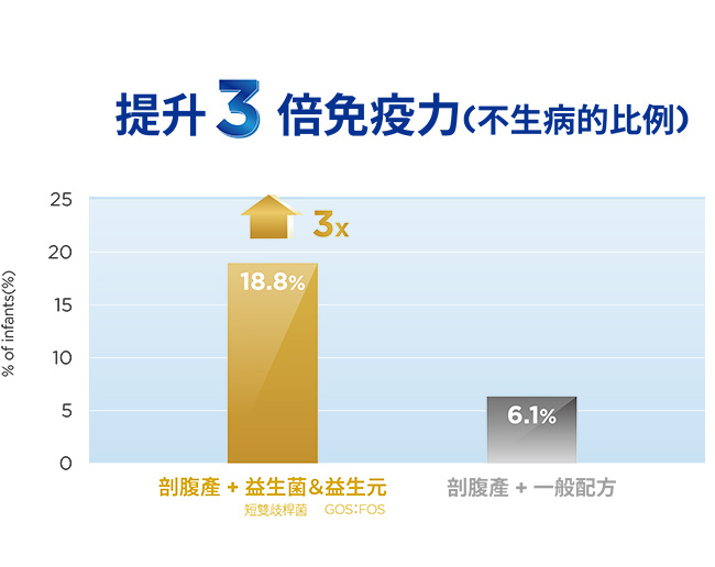 出生方式不同,讓寶寶需要的營養重點也大不同,近年國際研究發現,【短雙歧桿菌+益生元組合】不但幫助剖腹產寶寶剛出生時,快速建立好體質,持續使用到一歲,更可以建立長期的免疫保護。