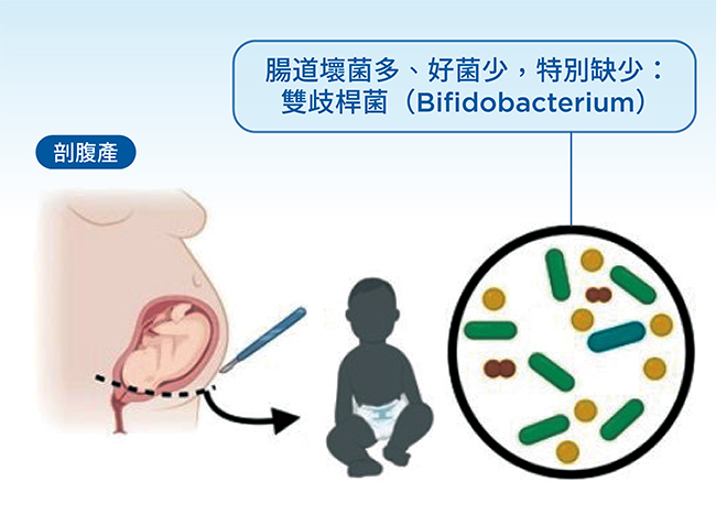 剖腹產寶寶因生產方式不同,未經產道擠壓,來自媽媽自然菌叢的洗禮,特別容易缺少關鍵好菌──短雙歧桿菌。這種菌叢差異影響腸道微生物環境,進而也讓未來的免疫力與體質發展有所不同。
